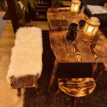 Charakteryzują się solidną konstrukcją! Często z wykorzystaniem dębu, świerku czy modrzewia. Funkcjonalność jest tu priorytetem. Skrzynie służyły jako pojemniki na ubrania, a podczas podróży stawały się kuframi. Stoły są proste i masywne, przystosowane do szybkiego montażu i demontażu. Całość impregnowana jest olejem lnianym, który chroni nadając ciepły, złoty połysk!